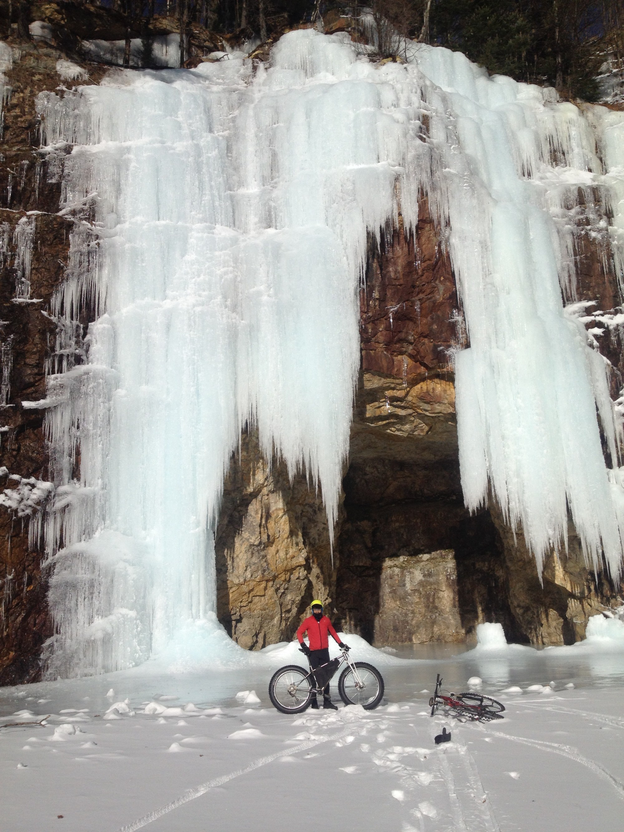 Last winter I got my first pair of studded fat-bike tires and it opened the door of possibilities even wider. Lakes and streams became frozen highways and icy trails could be ridden at speed. Even if you would rather stay on land, studs can give you more confidence. You can hit corners faster without worrying about catching a slick spot. Getting around town, where icy spots are common and falls are hard, becomes much less risky. Studded tires can be a significant investment but they should last several winters and will be cheaper than an injury.