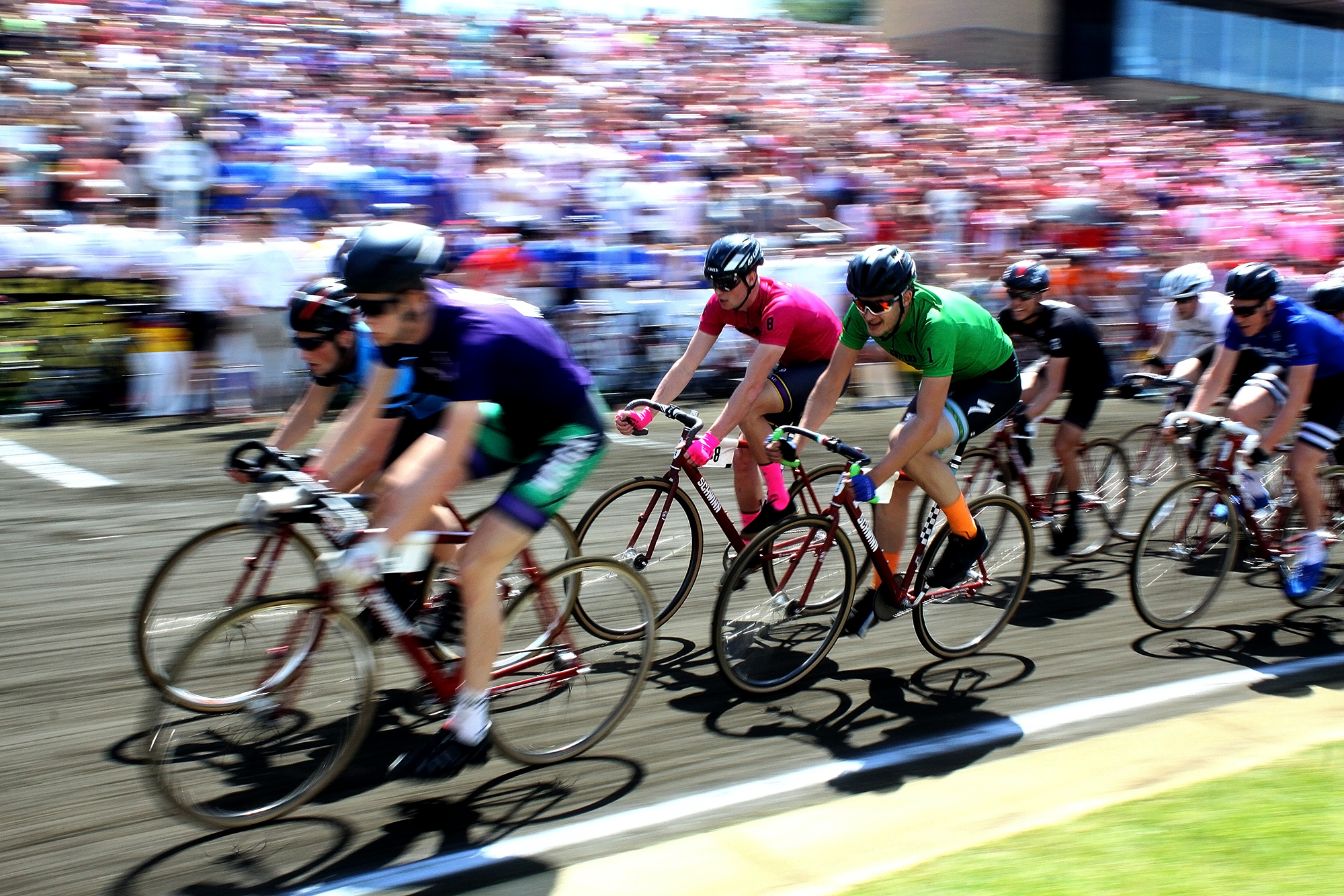 Riding in such close proximity at high speeds often results in some spectacular crashes, mitigated somewhat by the stadium’s cinder track, a better surface for crashes than pavement.
