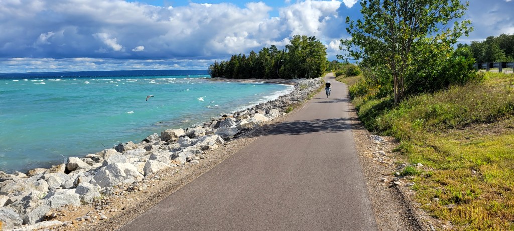 For me, however, the Petoskey-Charlevoix leg has been a steady favorite. Not only is the distance preferable (about 34 miles roundtrip), the scenery is, too. From beautiful, multi-level East Park, across the top of stately Bay Harbor and on to woodsy West Park and beyond, this section offers more – for me – than the Harbor Springs segment (about 20 miles roundtrip).